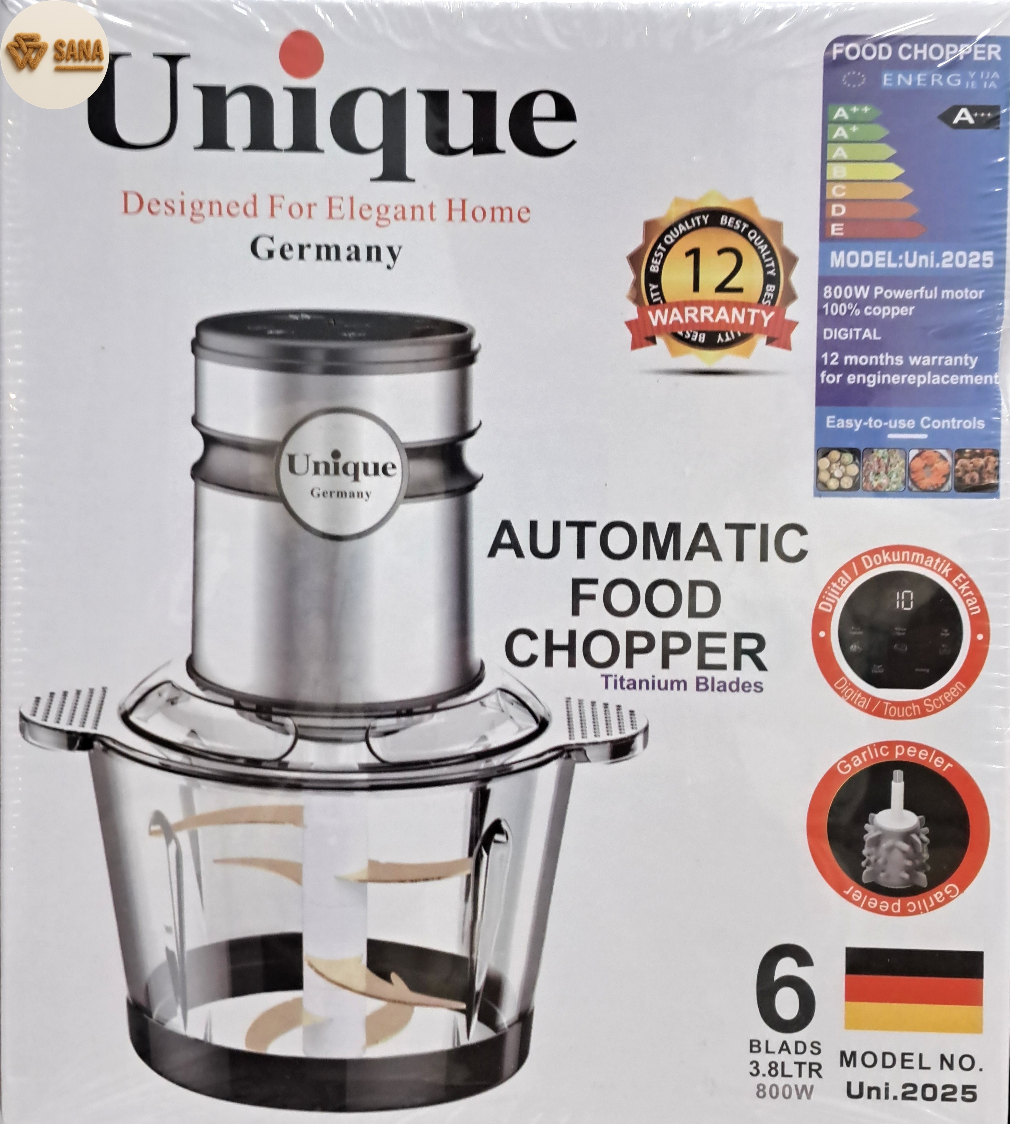 خردکن یونیک UNI-2025 با موتور تمام مسی 800 وات فوقالعاده قوی و کمصدا، کاسه شیشهای مقاوم 3.8 لیتری با دسته، تیغه 6 پره تیتانیومی سهلایه، بدنه تمام استیل ضدزنگ، صفحه کنترل لمسی دیجیتال، شفت و کانکتور فلزی (عمر طولانی)، پایه ضدلغزش و کاردک پلاستیکی رایگان، یکی از بهترین و شیکترین خردکنهای موجود در بازار ایران است. مناسب خانوادههای پرجمعیت و استفاده سنگین روزانه.